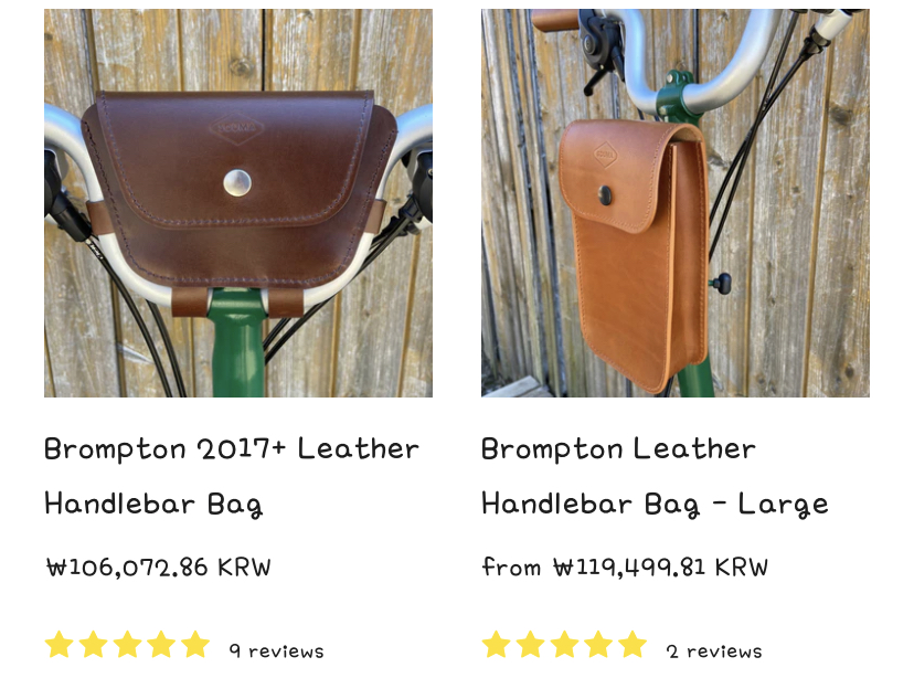 브롬톤이랑 클래식 자전거용 가죽 제품 만드는 체코 브랜드 핸들바 가방 캐리어 스트랩, 프레임 스트랩 프레임 스트랩은 자석으로 되어 있어서 벨크로로 된 제품들 보다는 나을 것 같다. 가죽 제품들이라 가격은 뭐 적당한 것 같은데 배송비가 얼마가 될지... 브롬톤용 제품은 더 있음. https://soumaleather.com/collections/brompton-collection Brompton Collection Unique, stylish and smart leather accessories that make your Brompton bike ride fun! soumaleather.com